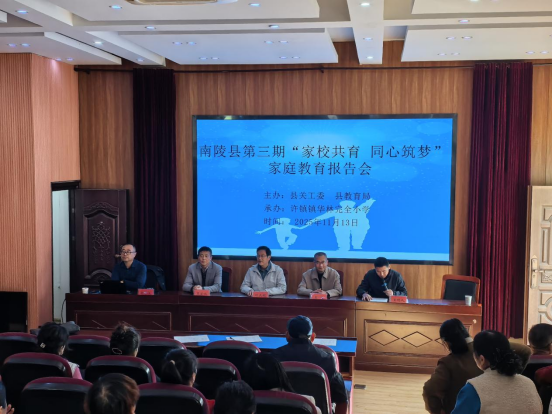 为进一步深化家校合作,凝聚育人合力,共同促进小学生全面健康成长,2025年11月13日,由南陵县关工委和教育局组织的第三期“家校共育 同心筑梦”家庭教育大讲堂宣讲活动走进许镇镇华林完全小学。县关工委常务副主任叶远明、办公室主任王波,教育局关工委王宏伙,学校校长王玉宝莅临报告会,学校70余名家长聆听报告。王玉宝主持报告会。