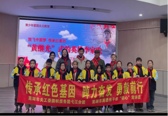 活动伊始,主持人殷满月老师向到场的领导嘉宾致以热烈欢迎。出席本次报告会的有弋江区关工委副主任聂建国、芜湖美彩国际旗帜报告团和弋江分团成员丁光海同志、芜湖市瑞阳小学副校长汪俊,以及学校关工委执行主任李玉萍老师。少先队员代表怀着崇敬之心,为各位领导嘉宾敬献红领巾,用最崇高的礼节表达对前辈们的敬意。