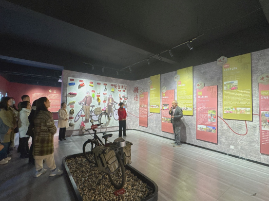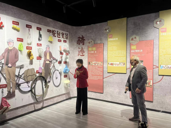 在“骑迹厅”,面对参观者,曹锦芬老师指向陈列的自行车、驮包、修车工具、雨衣、电吹风、电饭煲、运动摄像仪、洗菜盆、茶缸、洗漱用品、生活用品等,介绍他们红色骑行征途衣食住行及遇到的数不清的困难,同时深有感触地告诉大家真得体会到了革命前辈所走过的道路是多么的艰难困苦。两位老师说一定要感恩中国共产党为中国人民带来了幸福生活;他们还坚定地表示,老共产党员一定要讲好中国共产党的红色故事。