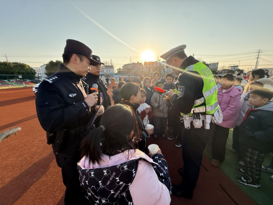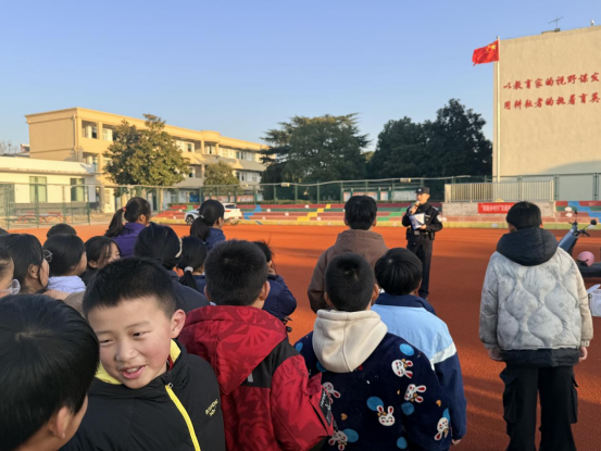 活动现场还设置了互动环节,毕磊和同事们为积极参与的同学们准备了印有反诈标语的小礼品,将现场气氛推向高潮。夕阳的余晖下,师生们与民警们合影留念,手中的标语牌"祝警察叔叔节日快乐"传递着最真挚的祝福。