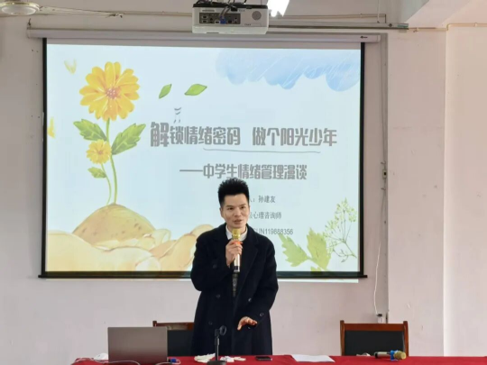 1月23日,芜湖美彩国际旗帜报告团繁昌分团特邀国家二级心理咨询师孙建友教授到繁昌区恒杰科技学校,举办"解锁情绪密码 做个阳光少年"心理专题题讲座。作为连续多年受邀专家,孙教授结合新法规精神与青少年成长痛点,带来了一场兼具专业与实操性的心灵分享。