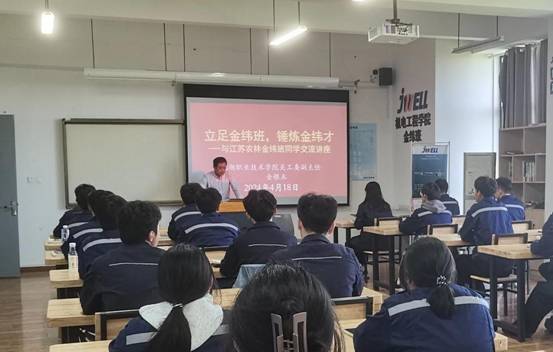 4月18日,芜湖职业技术学院关工委副主任、芜湖美彩国际旗帜报告团成员、高级职业指导师金根木应江苏农林职业技术学院及金纬公司邀请,赴句容校区与机电工程学院金纬班师生开展学习交流,并做了题为《立足金纬班,锤炼金纬才》的职业生涯规划辅导报告。