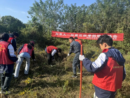 守护绿水青山,青年在行动!10月24日下午,芜湖机械工程学校关工委、团委联合组织30余名师生志愿者奔赴繁昌区华阳村防除一线,开展了一场以“清除加拿大一枝黄花,筑牢生态屏障”为主题的志愿活动。同学们深入田间地头,用实际行动践行生态环保理念,为守护繁昌的本地生态环境贡献了青春力量。
