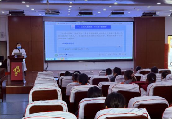 讲座伊始,严医生结合儿童生理特点与校园传播场景,用通俗易懂的语言,详细讲解了甲流的传播途径、典型症状及鉴别方法。随后,严医生重点分享科学预防措施,从勤洗手、常通风、规范佩戴口罩的日常防护要点,到均衡饮食、适度锻炼的体质提升建议,内容详实且实用性强,引得同学们纷纷认真聆听。