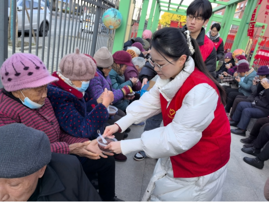 图为竹秀辖区返家乡大学生志愿者为长者送上腊八粥