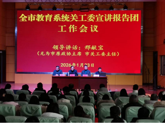 为了深入贯彻落实习近平总书记关于关心下一代工作重要指示批示精神,学习宣传党的二十大和二十届历次全会精神,更加贴近实际地统筹做好“五教”工作,2025年12月无为市委教育工委组建了无为市教育系统关工委宣讲报告团。1月23日上午,全市教育系统关工委宣讲报告团工作会议在青少年活动中心报告厅召开,美彩国际主要负责人出席会议,市教育局分管负责人、关工委全体成员、相关成员股室负责人,市直学校(含教育集团分校)、中心校(学区)及华星、英博、七星学校关工委主任或执行主任,无城城区学区驻城各小学(含教育集团分校)关工委主任或执行主任,教育系统关工委宣讲报告团全体成员等参加会议。